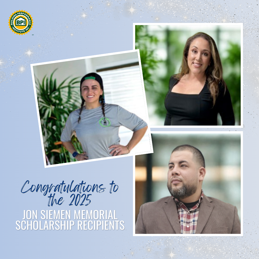 The Jon Siemen Memorial Scholarship honors the life and legacy of Jon Siemen, BPI’s dedicated Technical Relations Representative, who made a lasting impact on the building performance community before his passing in 2015. Each year, this scholarship supports four outstanding professionals by covering the costs of their BPI online and field exams, along with training and exam coordination.
