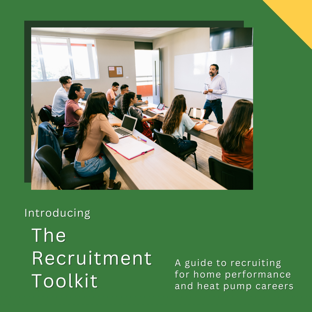 Want to get your students into good careers? A new free Recruitment Toolkit is available for you to enhance your career advising. It is easy to use, and is filled with facts, key messages, posters, and strategies to bring more people into heating and cooling, residential energy efficiency and home performance. This toolkit will save you time and money while increasing your successes.